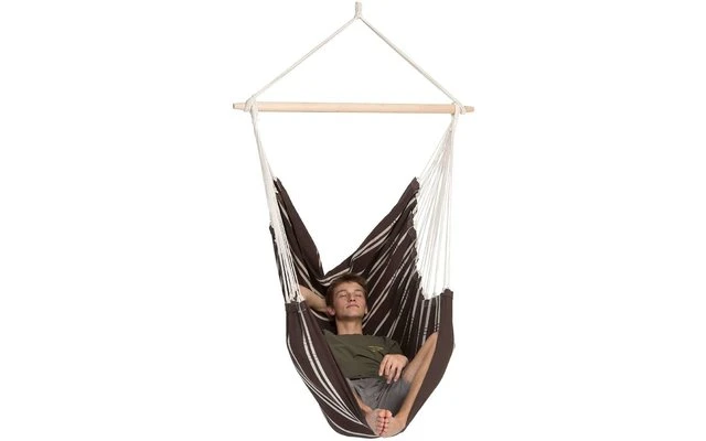 Wir verwenden den gleichen festen Stoff wie bei der XXXL-Hängematte Gigante, aufgespreizt mit einem gigantischen 1,40 m Holzstab, dessen patentierte Drechselung (innen dicker als außen) ein Verrutschen der Seile nach innen verhindert.